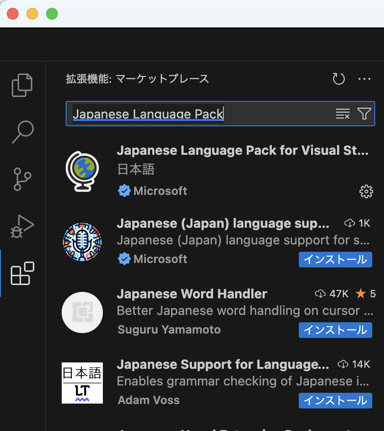 検索窓に『Japanese Language Pack 』と入力し「インストール」ボタンを押してインストールします。