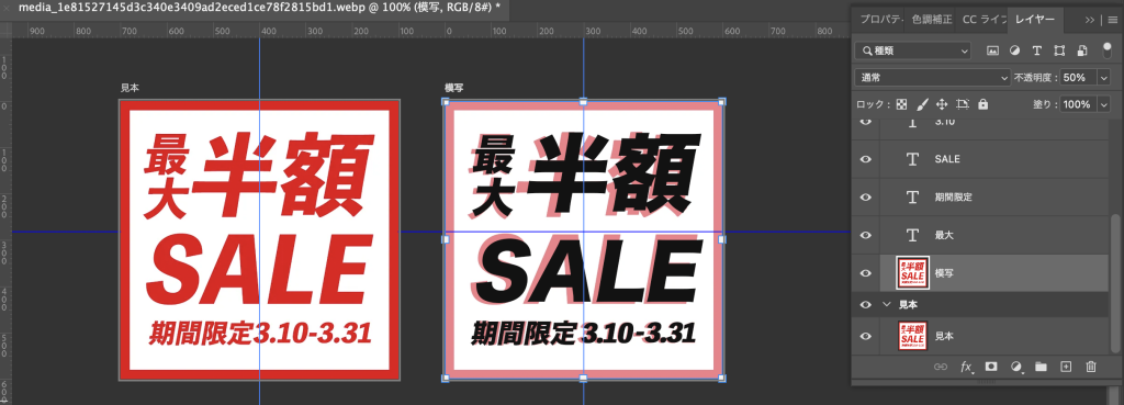2. コピーした方を透明度を下げる(50〜60パーセントがおすすめ)