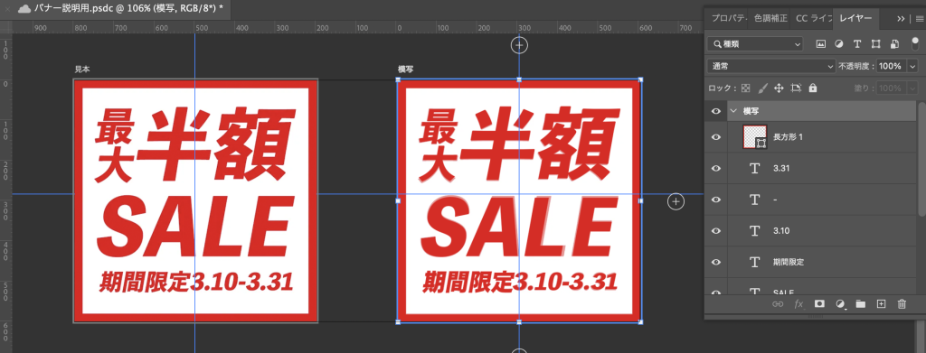 4. 配置を合わせたり(ガイドをつかう)、文字色を変更して完成。